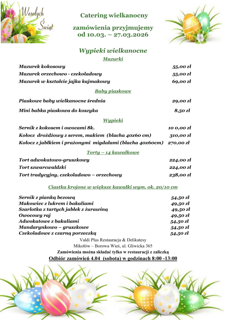 Odbiór zamówień 4.04 (sobota) w godzinach 8:00-13:00.